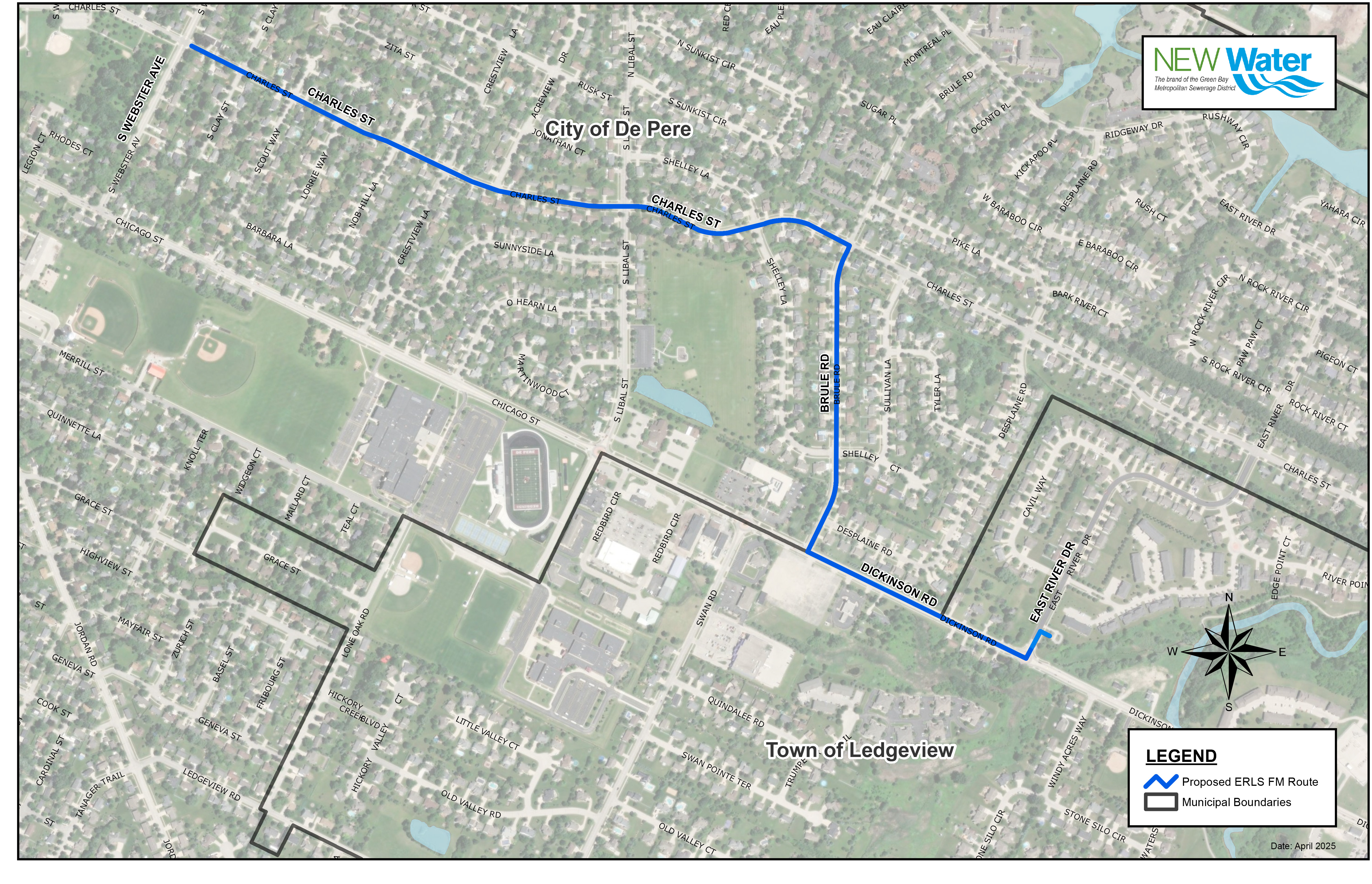 The East River Lift Station (ERLS) is part of NEW Water's sanitary sewer collection system. It serves an area east of the Fox River, including portions of the City of De Pere, Town of Ledgeview, and Village of Bellevue. The pump station was originally constructed in 1998 with three pumps and one force main. In 2005, a second force main was connected. The force mains are owned, operated, and maintained by NEW Water.
